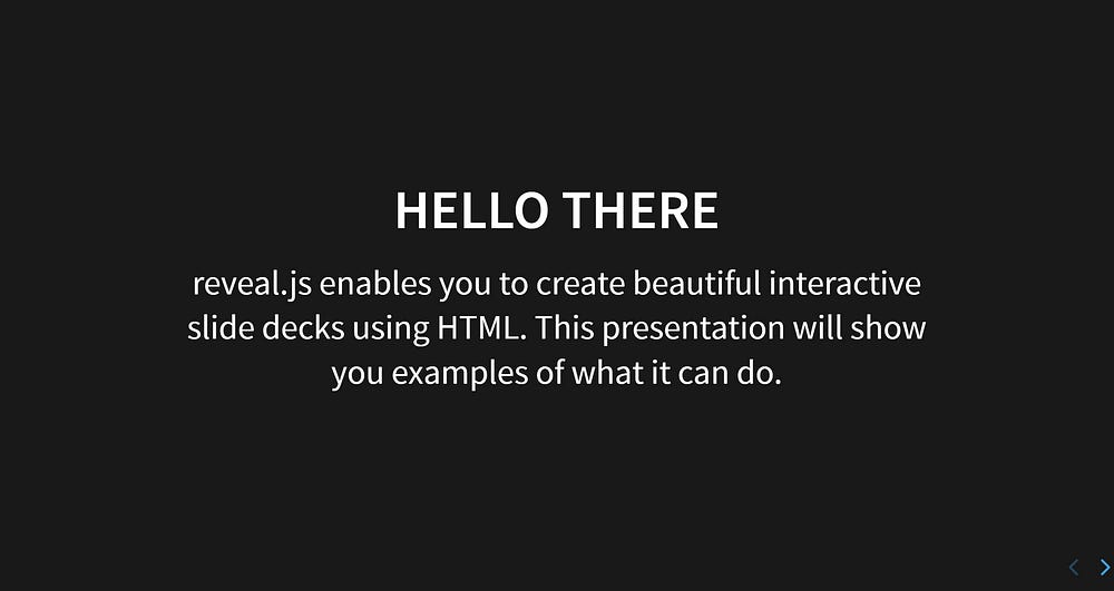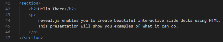 All we got to do now is open up index.html in a text editor or IDE, and you’ll see some HTML in there. For reference, in reveal.js, this is what a basic slide can look like: